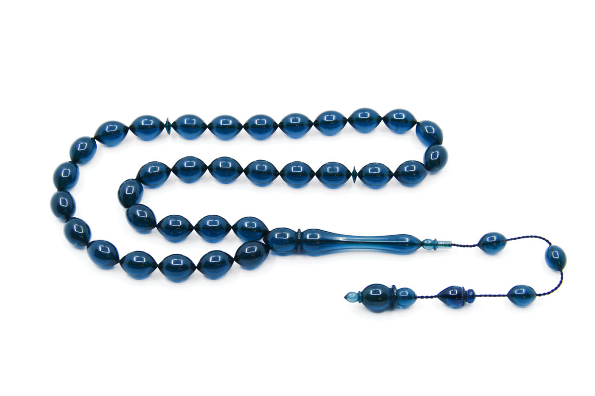 ATEŞ KEHRİBARI KLASİK İMAME BÜYÜK ELİPS KESİM MAVİ RENK SİSTEMLİ PÜSKÜL EL YAPIMI TESBİH